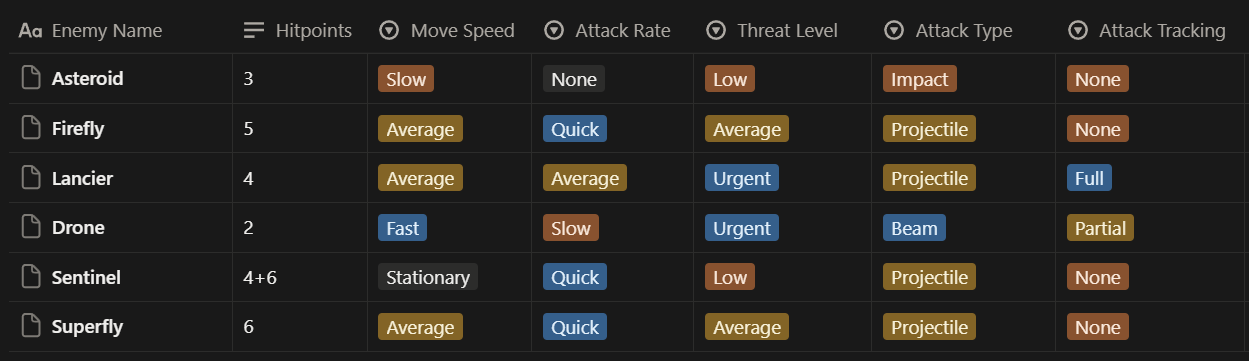 The enemy variety matrix I used to quickly concept new content.