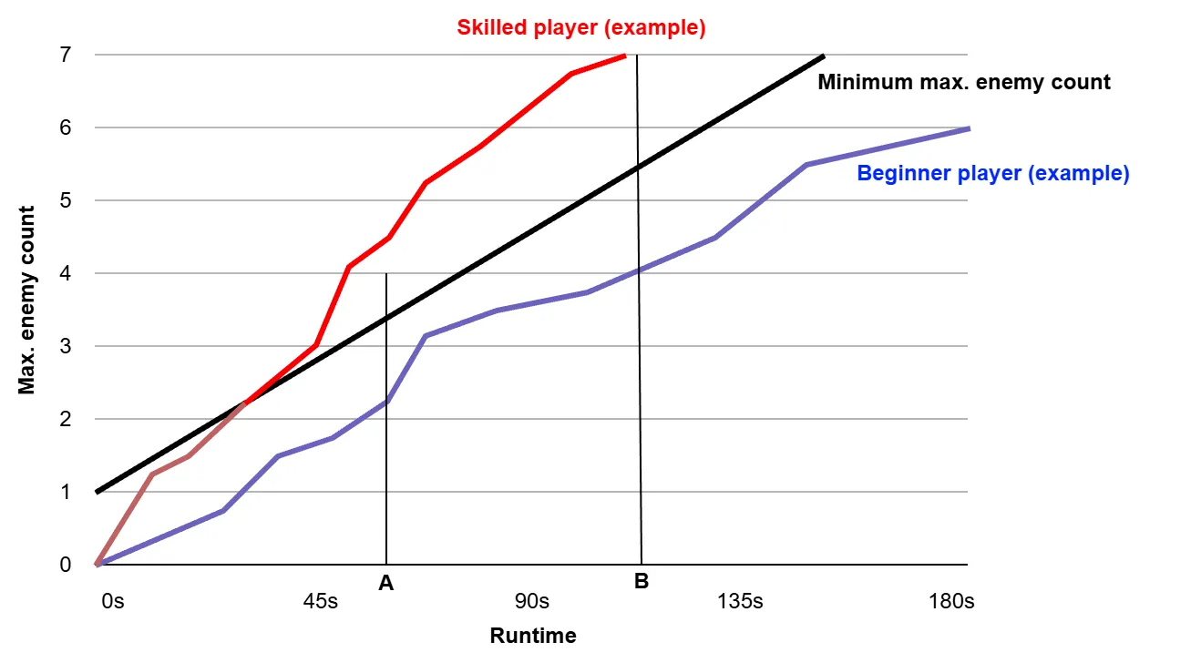 Example scenario with the hidden combat scores of two players. At point A the skilled player already faces 4 enemies to the beginner's 3. By point B the skilled player has hit the cap of 7, while the beginner faces 5 enemies.